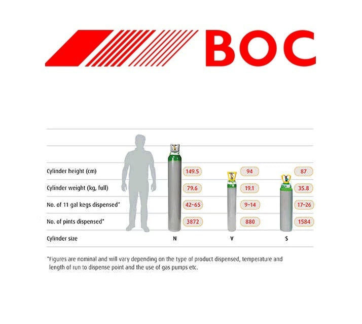Gas cylinder | Nominal gas content | No. of 11 gallon kegs dispensed1 | No. of pints dispensed1 |
